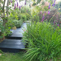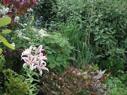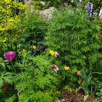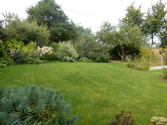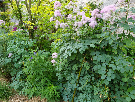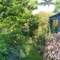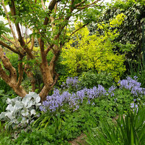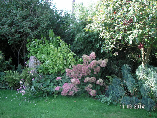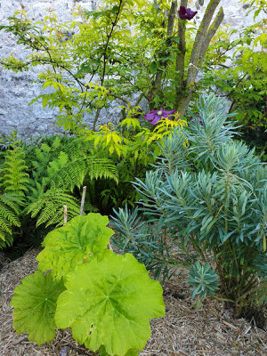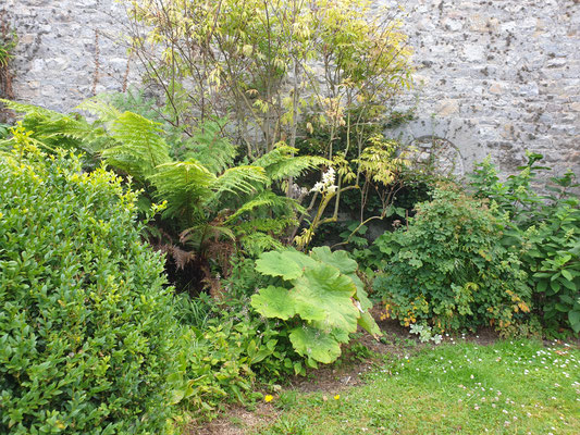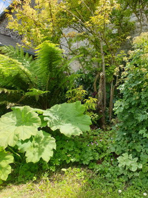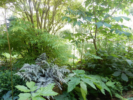 Jardin clos privatif de 600m2 :à l'ombre de l' aesculus parviflora et du sambuscus : fougères arborescentes , osmondes royales , ligulaires przewalskii, buis , astilboïdes, hostas, thalictrums